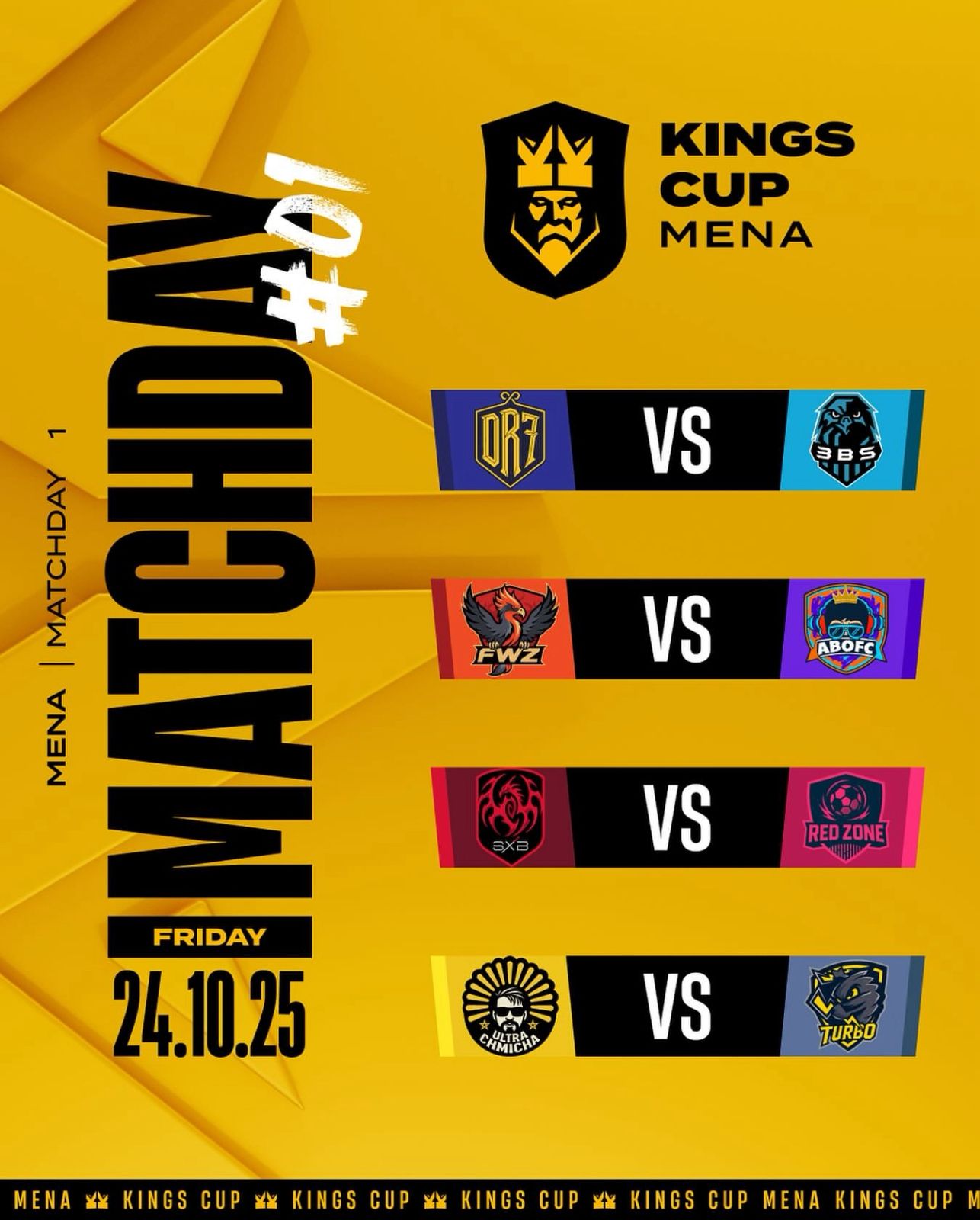 كما تشهد الجولة الأولى من البطولة أربع مباريات قوية تمزج بين التنافس الرياضي والرمزية العربية. حيث يفتتح فريق دربحة (DR7) من السعودية الموسم بمواجهة فريق عبسي (3DS) من الأردن في تمام الساعة 8 مساء. في لقاء عربي يترقبه الجمهور الخليجي والعربي بوصفه الانطلاقة الرسمية للدوري.
